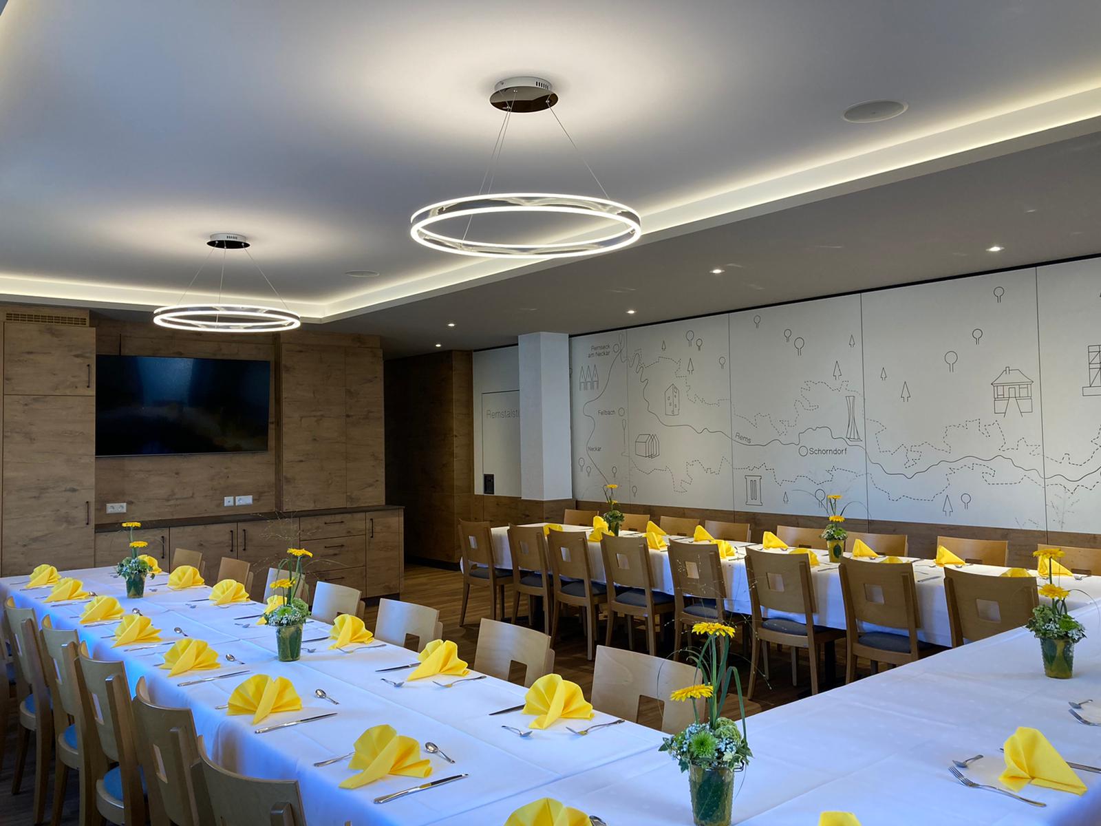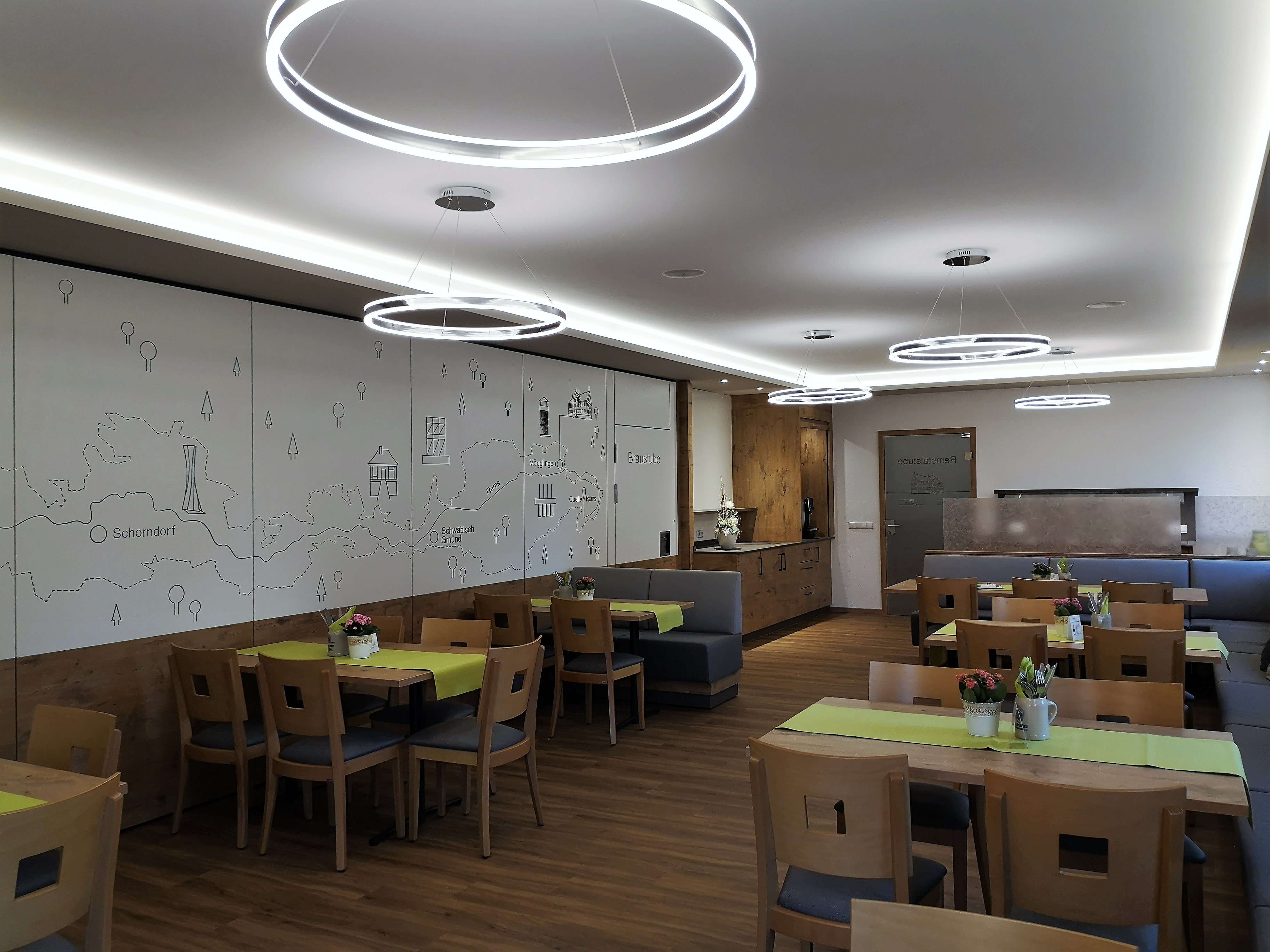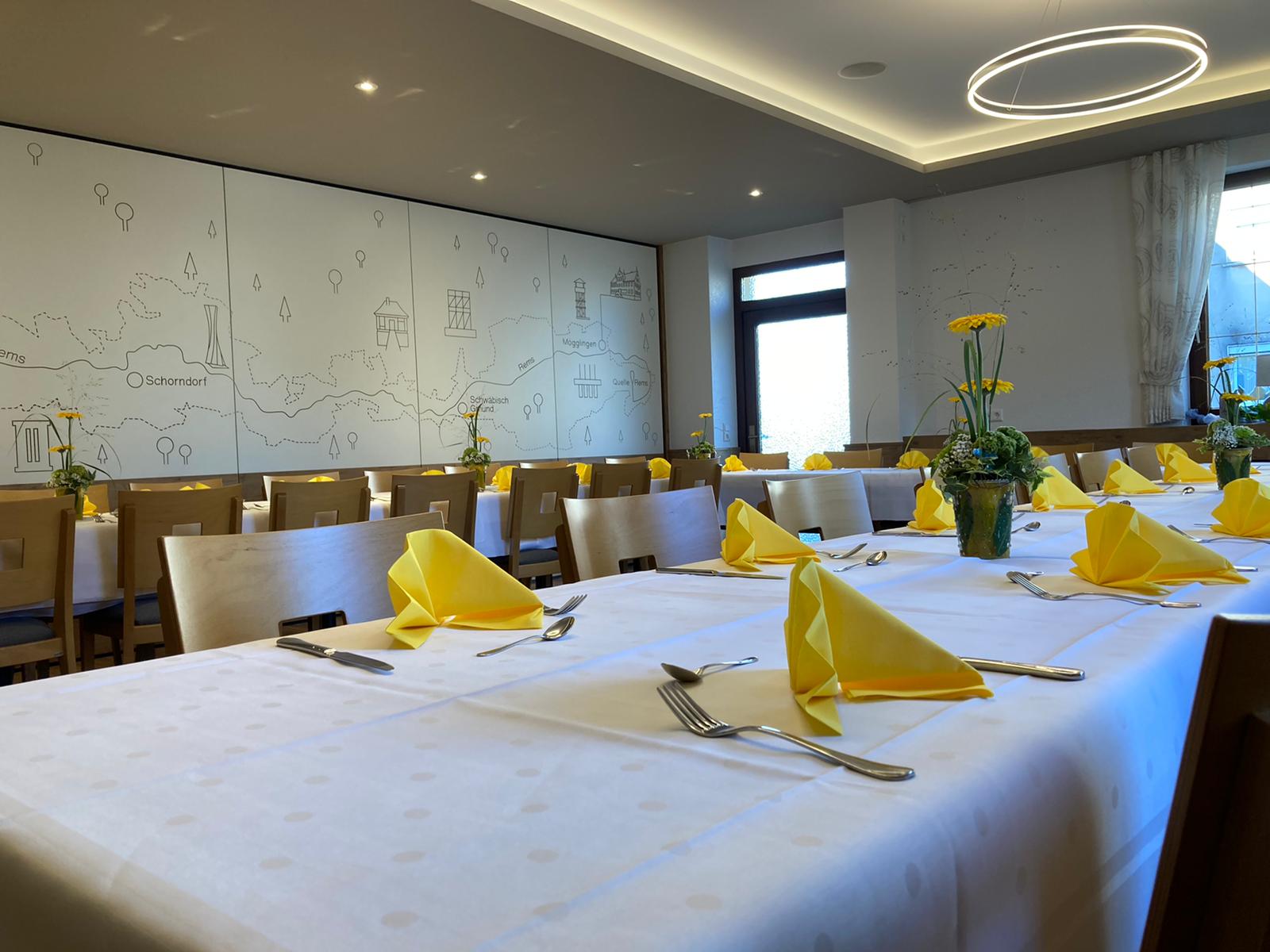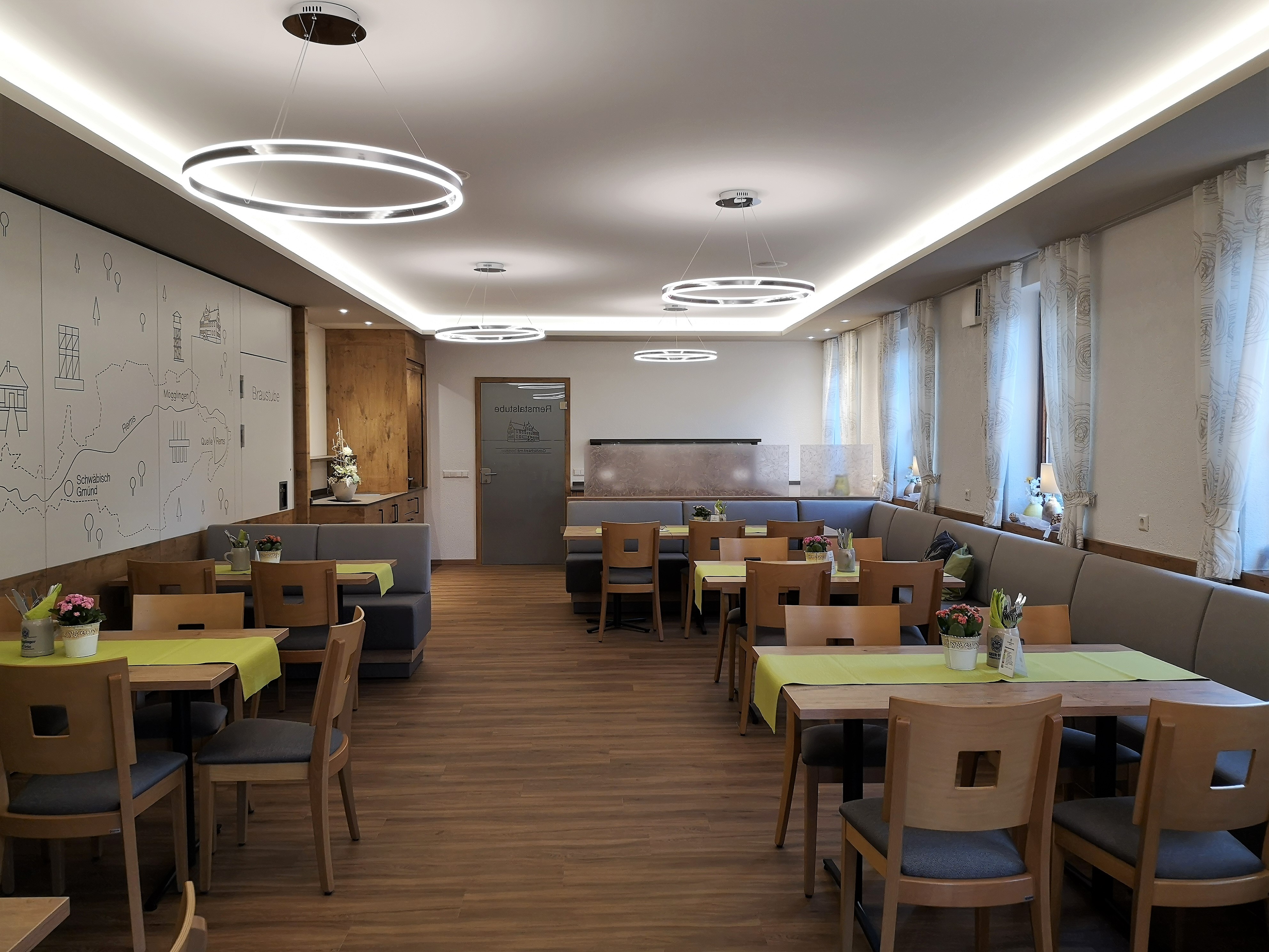 Unser ursprünglicher Festsaal wird durch eine mobile Trennwand zur gemütlichen Remstalstube und Braustube. Unsere Trennwand sorgt für ein dekoratives Highlight...unser Remstal, die Rems von der Quelle bis zur Mündung wurde hier optisch ausgefräst.