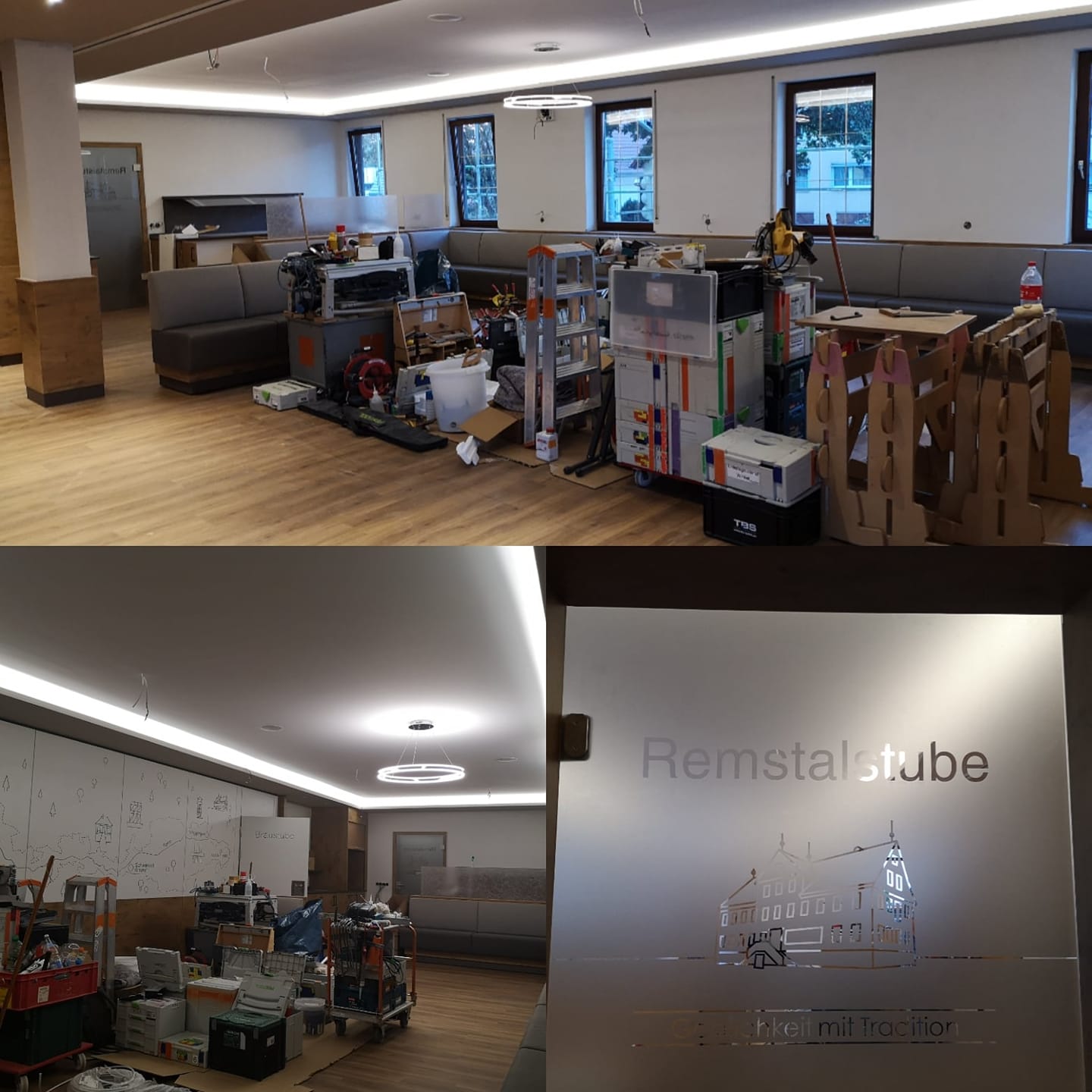 Endspurt im neuen Saal, welcher künftig zur gemütlichen Remstalstube und Braustube wird. Für größere Veranstaltungen und Feiern lässt sich dieser dann durch die mobile Trennwand in einen großen Saal verwandelt.